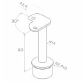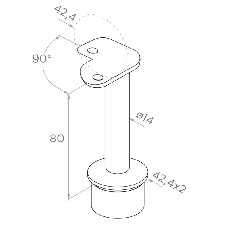 Bæreren er fremstillet af rustfrit stål AISI 304 i poleret finish (højglans), hvilket garanterer høj korrosionsbestandighed og elegant udseende. Konstruktionen består af cylindrisk base tilpasset stolperør 42,4×2 mm, tap med diameter Ø14 mm samt monteringsplade med to huller, hvorpå rækværket med diameter 42,4 mm hviler. Højden fra stolpe til rækværk efter montering er 80 mm.