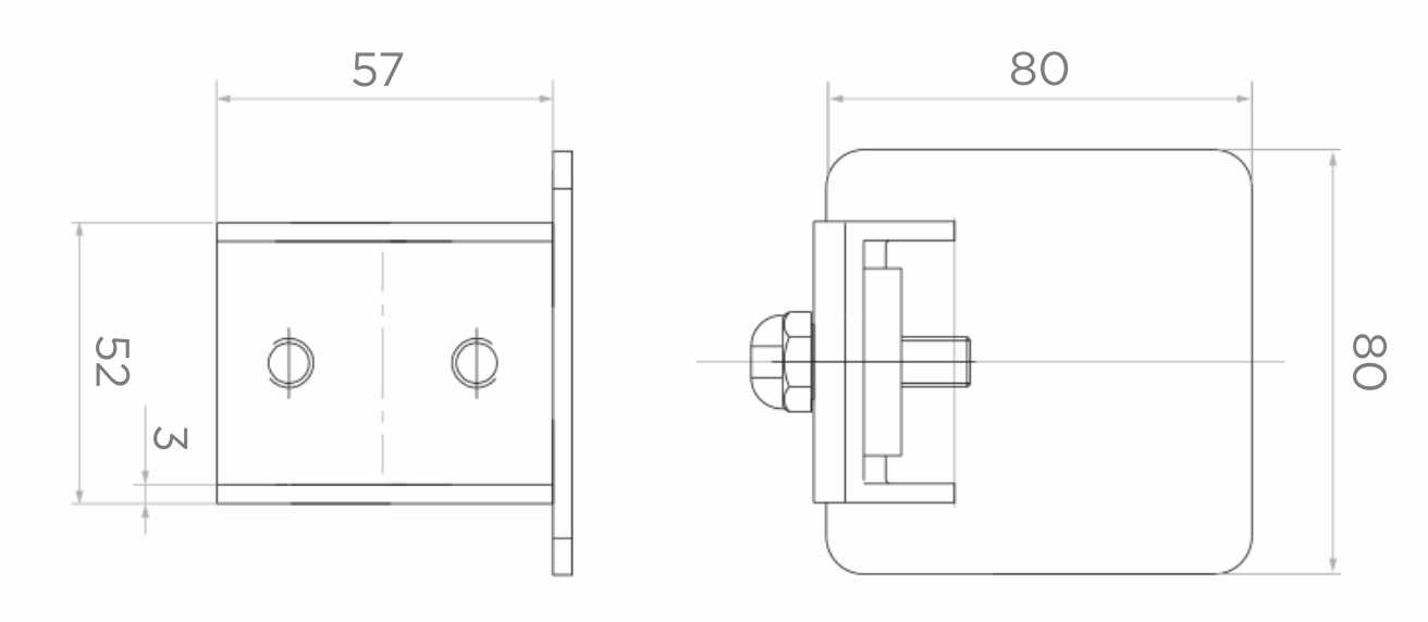 Elementet består af frontplade 80×80 mm og en indskubsdel på 57 mm længde, som går direkte ind i skinnens lysning. Konstruktionen er enkel og funktionel — montering sker ved at skubbe slutkappen ind i profilet og spænde fast med medfølgende monteringsskruer. To spændskruer garanterer sikker og holdbar fastgørelse uden behov for svejsning.