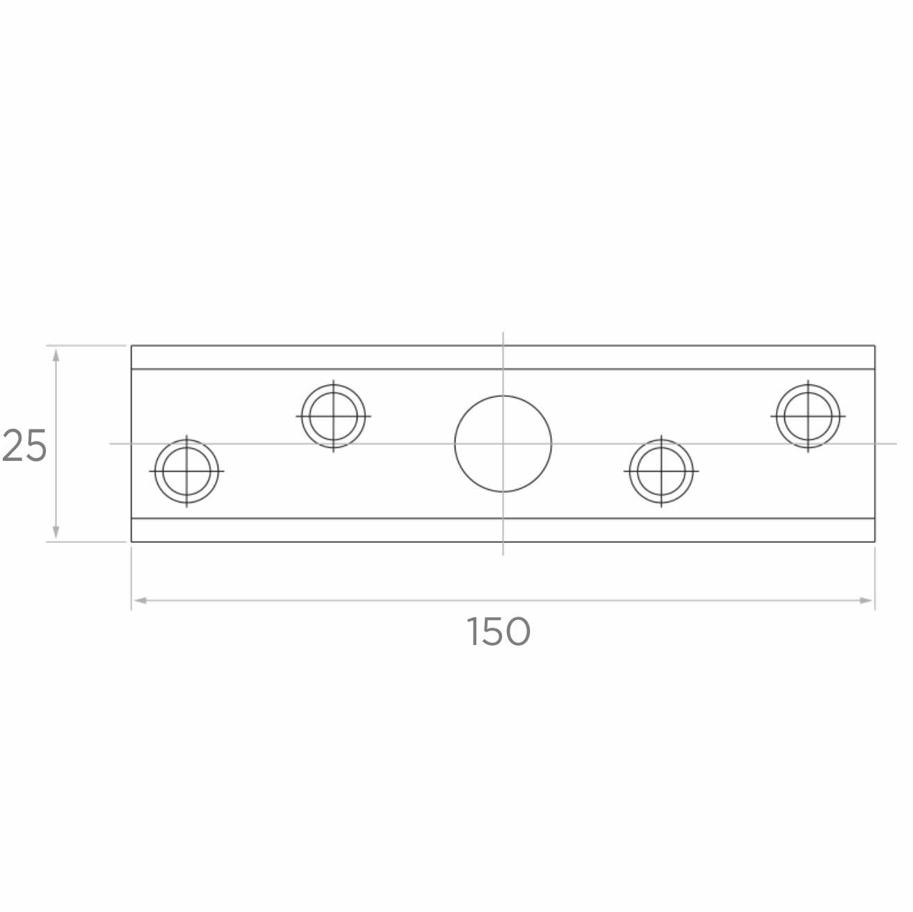 Pladen er udstyret med fire monteringshuller placeret symmetrisk på begge sider af det centrale led samt ét centralt hul med større diameter, hvorigennem drejeelementet går. Denne konstruktion muliggør sikker og stabil fastgørelse til portrammen, samtidig med at drejeleddets bevægelsesfrihed bevares.