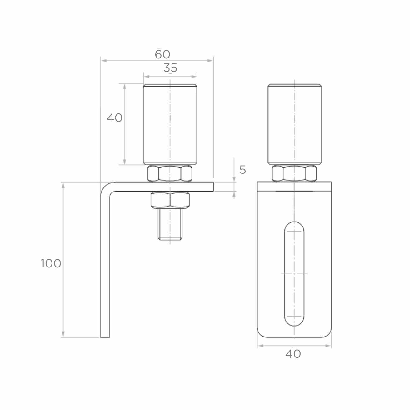 Sammen med kuglen leveres monteringsvinkel med langhul (bønne), som muliggør positionsjustering af kuglen lodret. Justeringshullet gør det muligt at tilpasse højden af c-profil styringen uden behov for ny boring af huller i stolpen — dette er en betydelig lettelse på monterings- og servicestadiet af skydeporten.