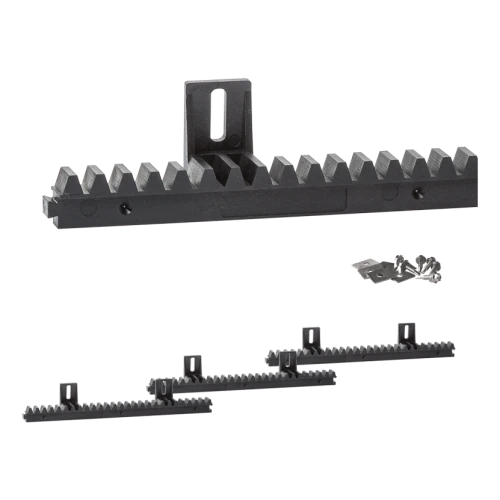 Sættet indeholder tre sektioner af tandstang med længde 333 mm hver, som forbindes med hinanden ved hjælp af låse — derved opnår du en sammenhængende tandstangslinje uden behov for præcis tilskæring. Hver sektion er udstyret med to monteringsbeslag, som muliggør hurtig og nem fastskruning af tandstangen til dørbladet. Til sættet medfølger også selvborende skruer med underlagsskiver, hvilket eliminerer behovet for at samle separate fastgørelseselementer — alt, hvad der skal bruges til montering, er i én pakke.