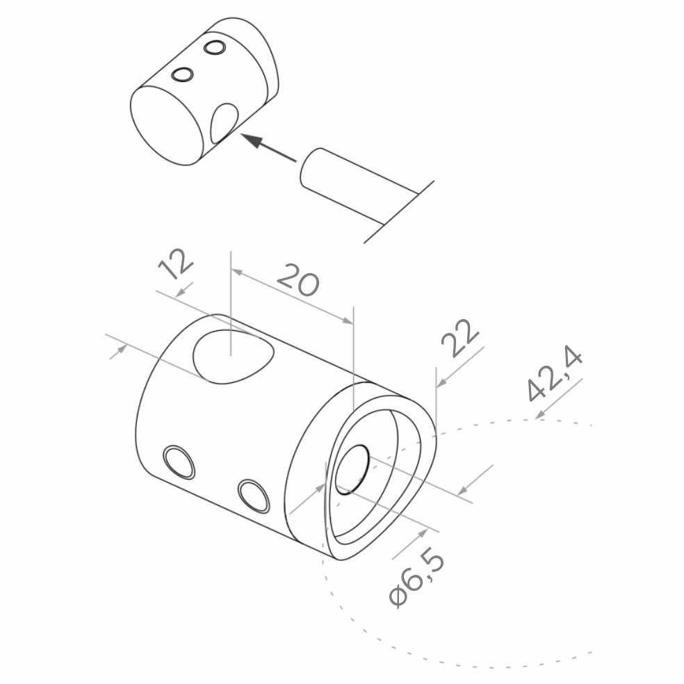 Håndtaget er beregnet til montering af stangfyld i rustfrie rækværker baseret på 42,4 mm rørsystem. Anvendt parvis (venstre + højre) sikrer det pålidelig fastgørelse af fi 12 mm stænger i rækværkets plan. To sidehuller til klemskruer tillader permanent låsning af stangen inde i håndtaget, og det centrale monteringshul ø 6,5 mm muliggør fastgørelse af elementet til stolpen ved hjælp af en gennemgående skrue.