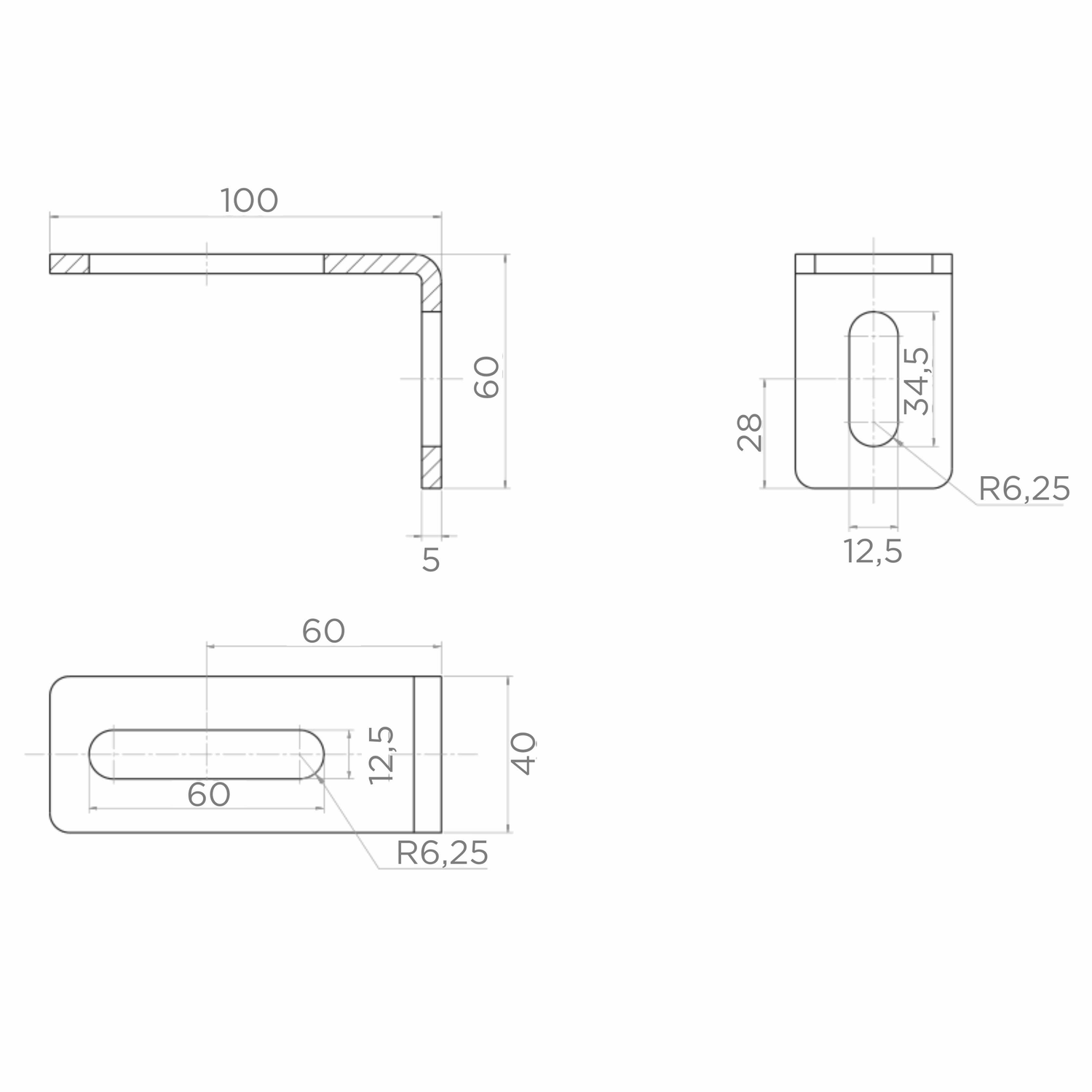 - Ovalt hul – vandret arm: 60 × 12,5 mm (bueradius R 6,25 mm)