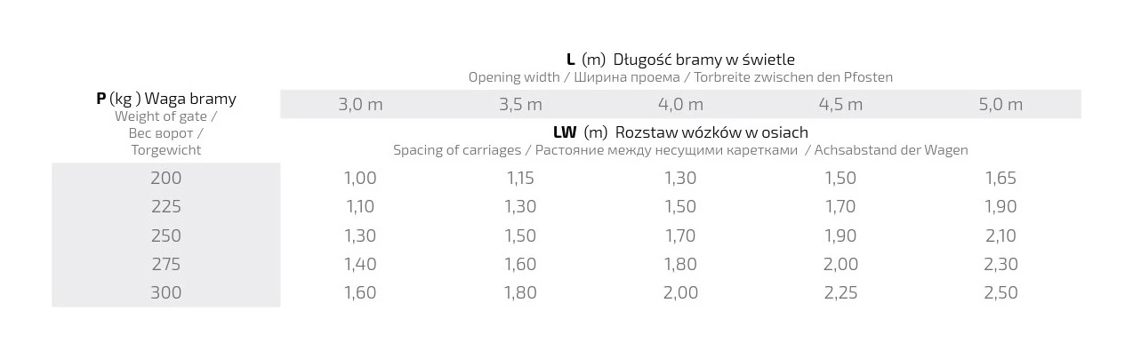 Den korrekte afstand mellem løbehjulene (LW) afhænger af portens lysvidde (L) og portens vægt (P). Nedenstående tabel viser de anbefalede hjulafstande i meter, som garanterer optimal drift og systemets holdbarhed: