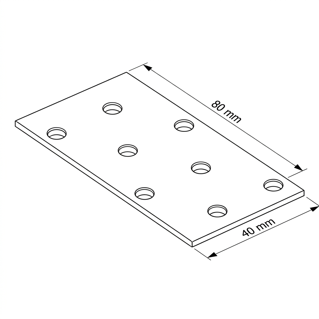 Flad samler 40×80 mm er en universel perforeret plade beregnet til konstruktionsforbindelser, hvor sidefladerne på de sammenføjede elementer ligger i samme plan. Takket være 8 huller symmetrisk fordelt på pladens overflade giver dette element mulighed for både enkle og mere komplekse forbindelser — særligt ved montering af tagspær og trækonstruktioner.