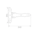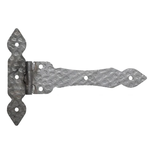 Dekorativt båndehængsle Postal i T-form er et solidt, stålbeslag beregnet til montering på porte, låger, trædøre og andre konstruktioner, hvor både funktionalitet og æstetik er vigtig. Den dekorative, hamrede overflade giver hængslet et smedekarakter, ideelt til rustikke og traditionelle stilarter.