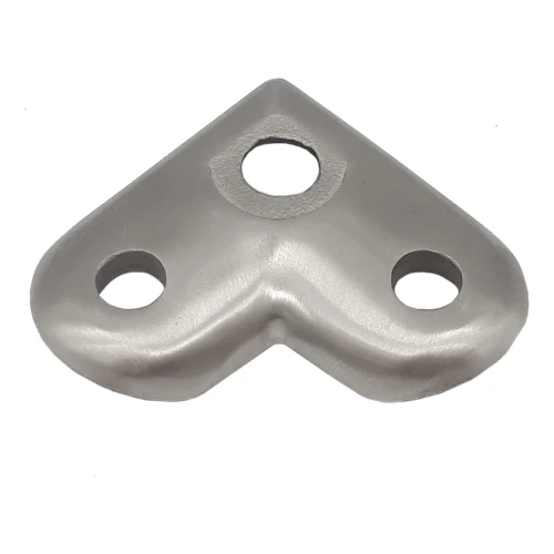 Pladen er beregnet til fastgørelse af gelænderbeslag på hjørner — der hvor balustradernes forløb ændrer retning. Montering sker ved at skrue pladen fast fra oven til en flad overflade (f.eks. søjle eller bæresøjle). Tre monteringshuller sikrer en sikker trepunkts-fastgørelse og eliminerer risikoen for rotation af elementet under belastning.