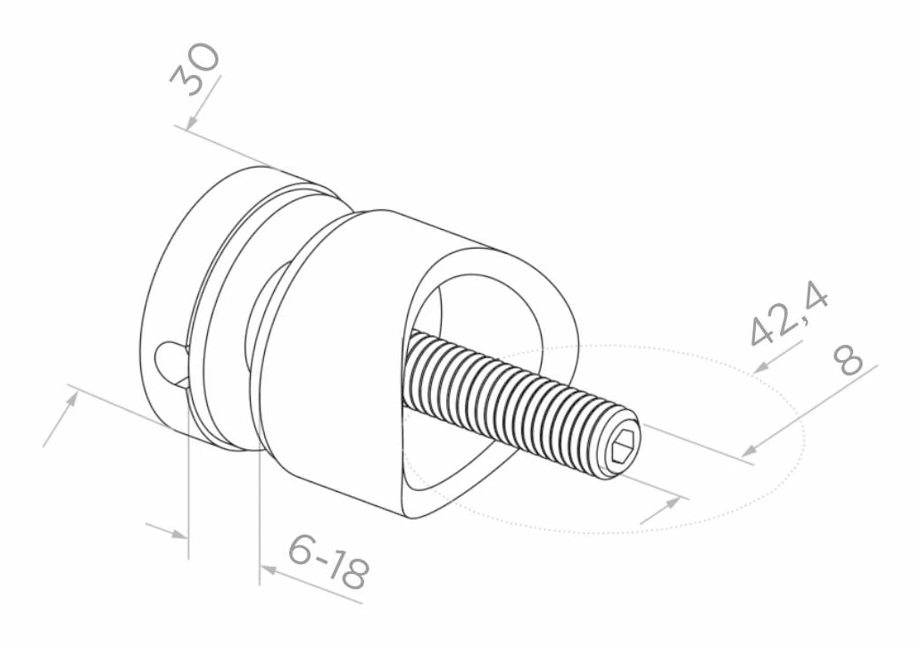 Rotulaen understøtter og stabiliserer perfekt den monterede glasplade. Takket være trykgummi i sættet sikrer beslaget elastisk og sikker tilspænding, der beskytter glaskanter mod beskadigelse. Justeringsområdet for glastykkelse er 6–18 mm, hvilket giver stor anvendelsesfleksibilitet — fra tynde dekorative paneler til tykkere rækværksglas. Monteringselementet er udstyret med M8 gevind, hvilket garanterer sikker og stabil fastgørelse til bærekonstruktionen.