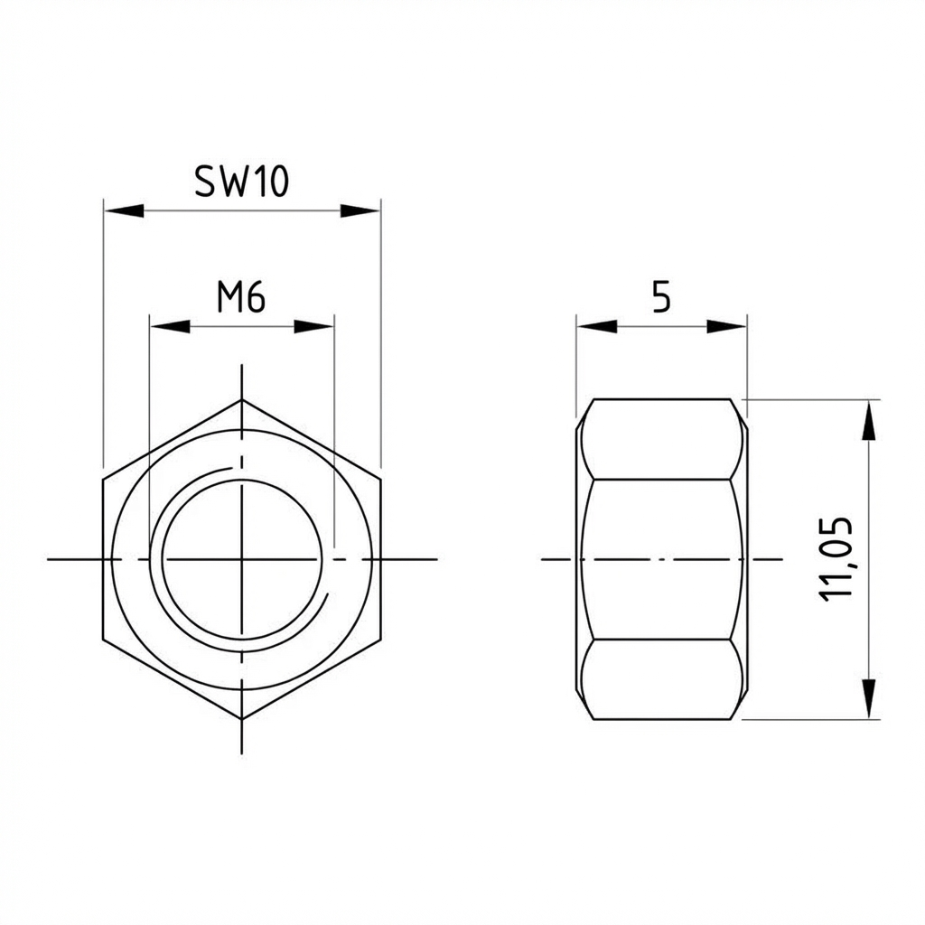 Overholdelse af DIN 934-standarden betyder en standardiseret sekskantform, som muliggør nem tilspænding med enhver standard nøgle. Møtrikken kan genbruges og passer til alle metriske M6-bolte med højregænget gevind.