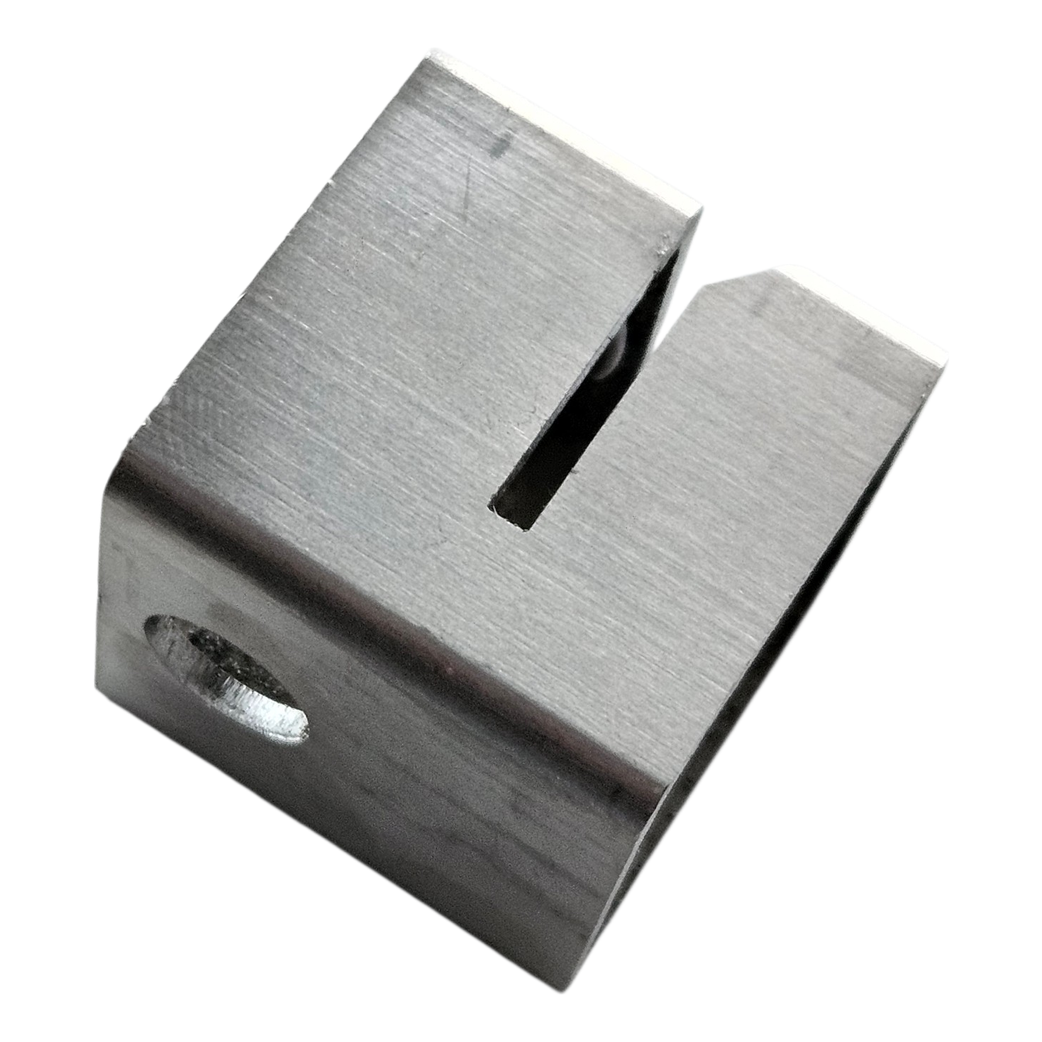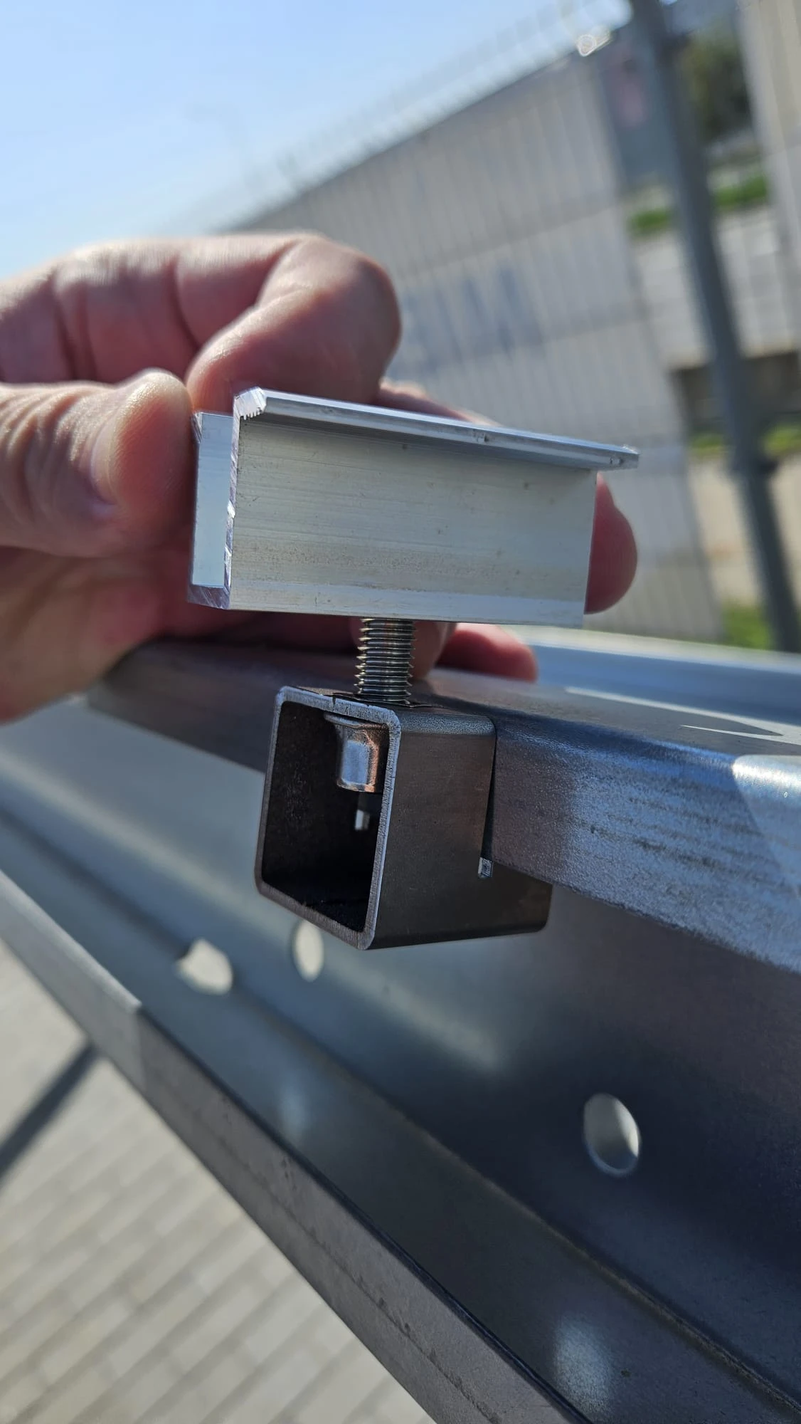 Beslaget skubbes på kanten af spæret og derefter spændes med en M8 skrue, der går gennem hullet med indvendigt gevind. Det således forberedte monteringspunkt kan optage enhver klemme — side- eller mellem — hvilket giver installatøren fuld frihed til at placere PV-moduler.