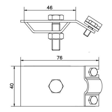 Mål og montering. Den kompakte konstruktion (76 × 46 × 40 mm) letter monteringen selv på svært tilgængelige steder. Holderen sættes på rendekanten, hvorefter skruerne strammes — lynlederen fastgøres sikkert uden risiko for løsning under påvirkning af vind eller vibrationer.