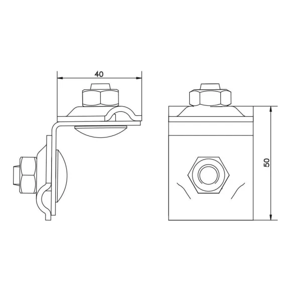 Fastgørelsen udføres ved hjælp af to skruer M10×30 i galvaniseret stål, hvilket sikrer en sikker og stabil forbindelse til tagunderlaget. Kompakte dimensioner (40×50 mm) letter monteringen selv på vanskeligt tilgængelige steder.