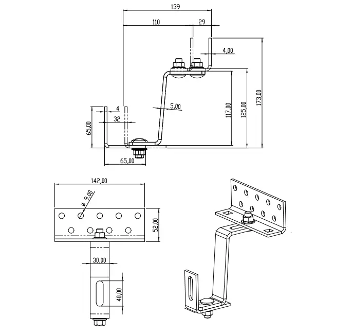 Muliggør forbindelse af profiler med tagdækningen. Vario-beslaget monteres på skinnens nederste kanal ved hjælp af en skrue. Anvendes hvor standard tagbeslag (uden justering) er for korte.