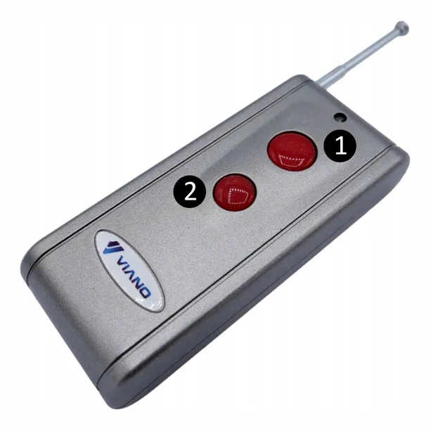 Apparatet betjenes ved hjalp af den medfolgende fjernbetjening med udtrakkelig antenne. Knap 1 bruges til at tande og slukke for skrammeren, og knap 2 bruges til at aktivere blitzfunktionen samt manuel udlosning af lydemission. Fjernbetjeningens rakkevidde i abent terran er op til 500 m, hvilket giver bekvem styring selv pa stor afstand.