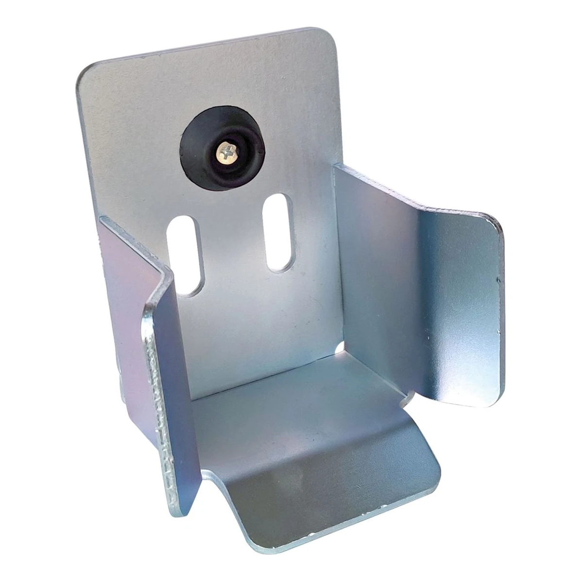 Påkøringslejet guider portfløjen og forbedrer stabiliteten i hele systemet. Monteringen er hurtig og enkel — elementet skrues fast på den nederste del af afslutningsstolpen. Sammen med påkøringsrullen danner det et sæt, der leder porten ind mod stolpen, letter sikker lukning og reducerer vibrationer. På bagsiden findes to monteringshuller samt en gummistødpude, der absorberer stødene ved portfløjens ankomst.