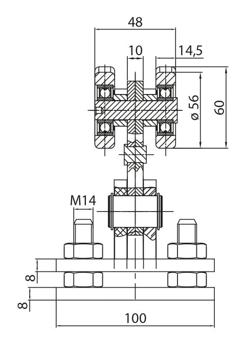 Målstegningen viser et tværsnit af løbevognen med de vigtigste mål angivet. Det to-niveaus rullesystem sikrer optimal kraftfordeling, og den dobbelte bundplade med justering via M14-skruer giver mulighed for præcis indstilling af portfløjens højde og lodrethed efter montering.