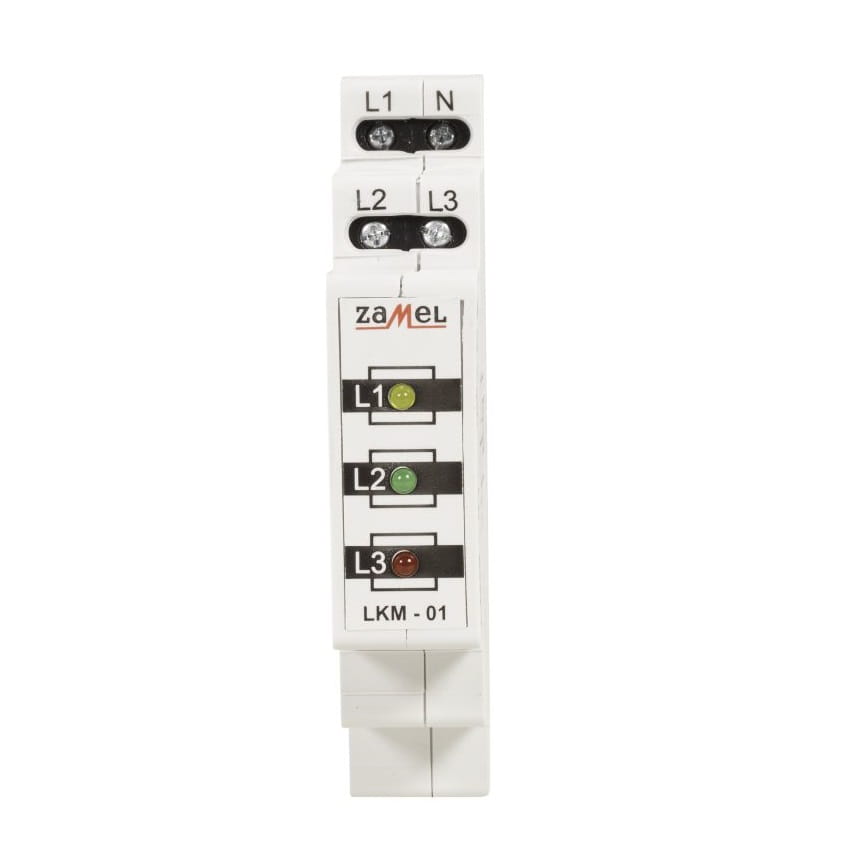 Den har tre lysdioder med høj lysstyrke, mærket L1, L2, L3. En yderligere fordel ved LKM-01-40-modellen er, at den kan bruges i et trefaset TN-netværk, dvs. et netværk med en N-neutral ledning. Enheden er monteret på en TH 35-skinne, så den kan tilpasses ikke-standardiserede applikationer. Enkeltmodulhuset og de holdbare lysende elementer garanterer lang og pålidelig drift af indikatoren.